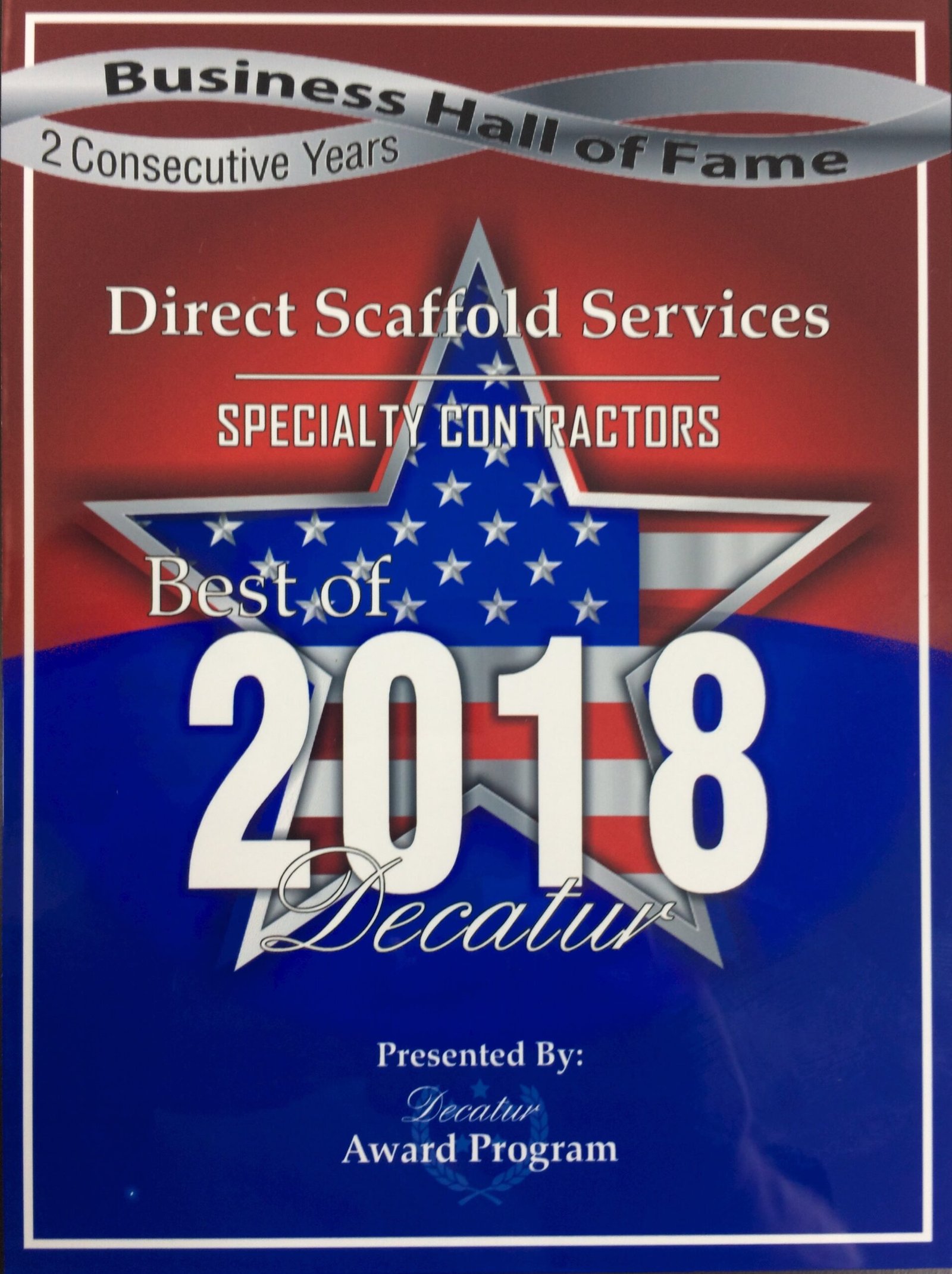 For two years straight, the business district in Decatur, AL awards Direct Scaffold Services “Best of 2018 Specialty Contractors”. The 2 consecutive years award placed them in the Business Hall