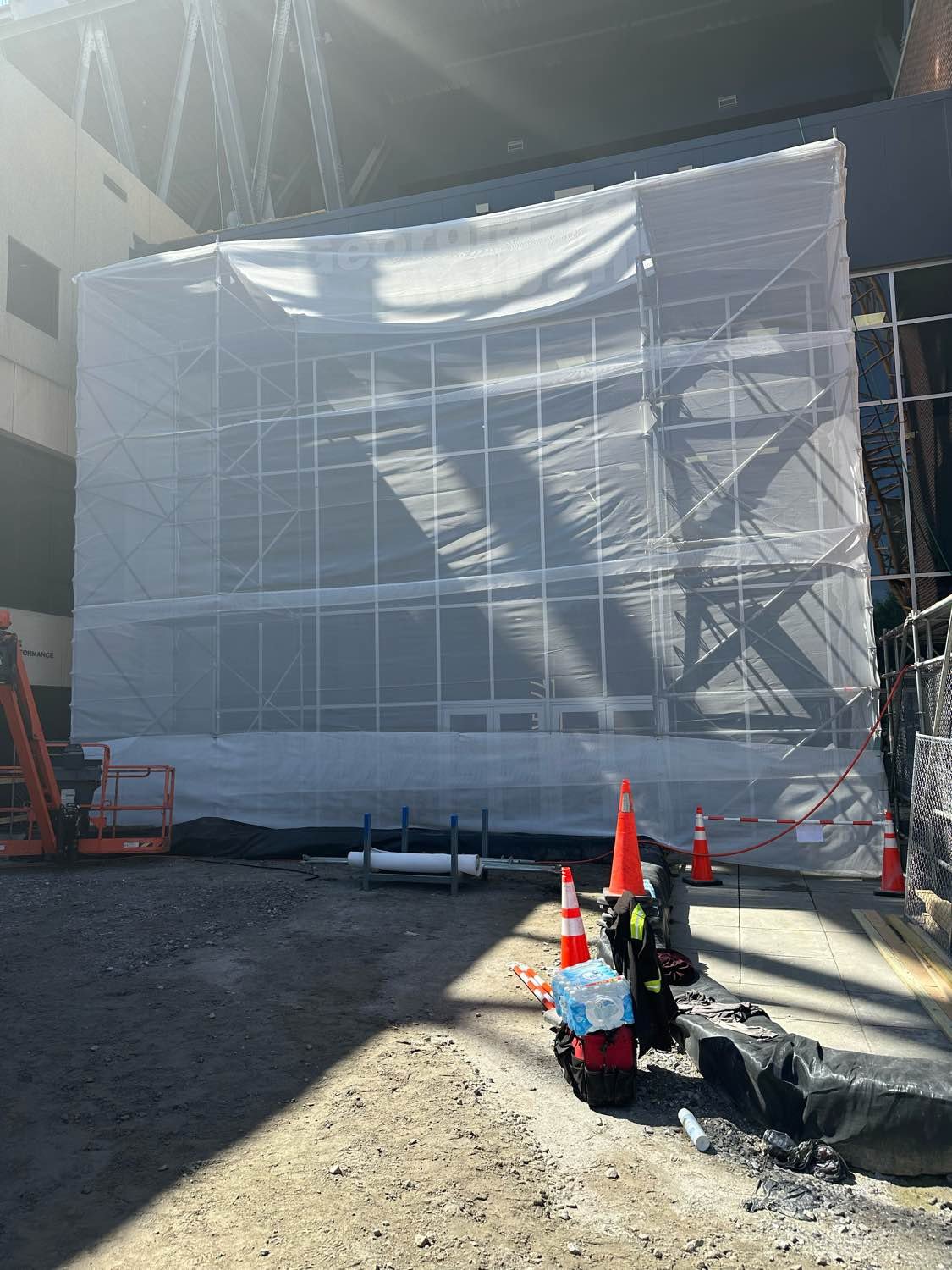 DSS erected scaffolding to protect the glass curtain wall on the stadium as another portion was being demolished.